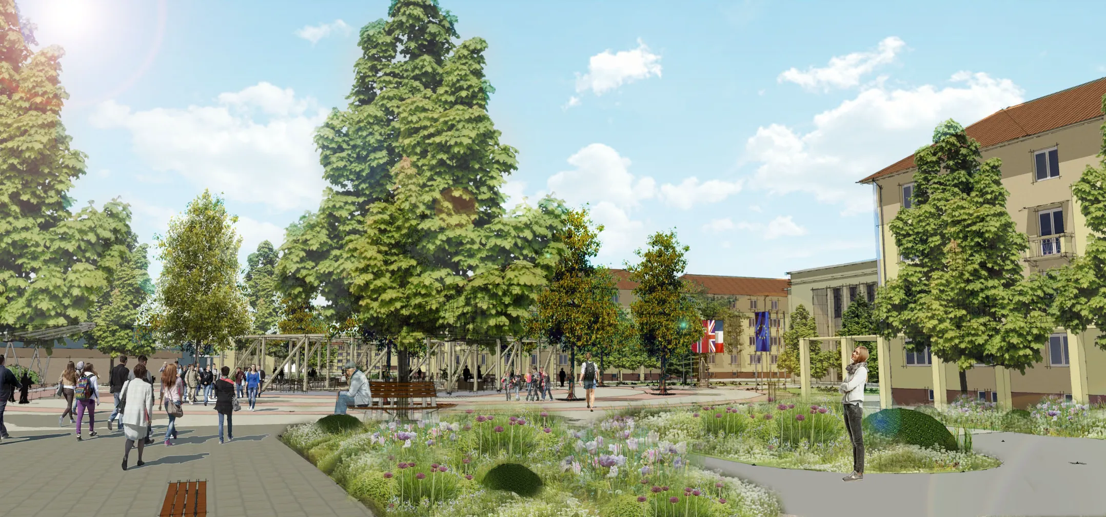 Vytvoriť zelenšiu centrálnu mestskú zónu, pretvoriť kruhové námestie so 4 zakrpatenými kultivarmi líp na zelenšie aby zeleň vytvrárala aj tieň a revitalizovať ulicu Moyzesova