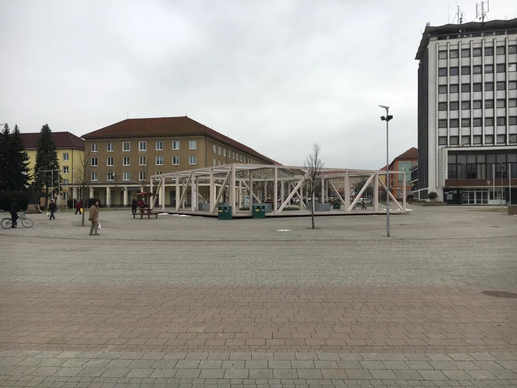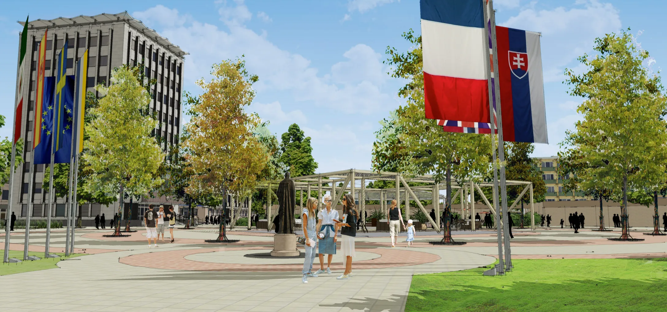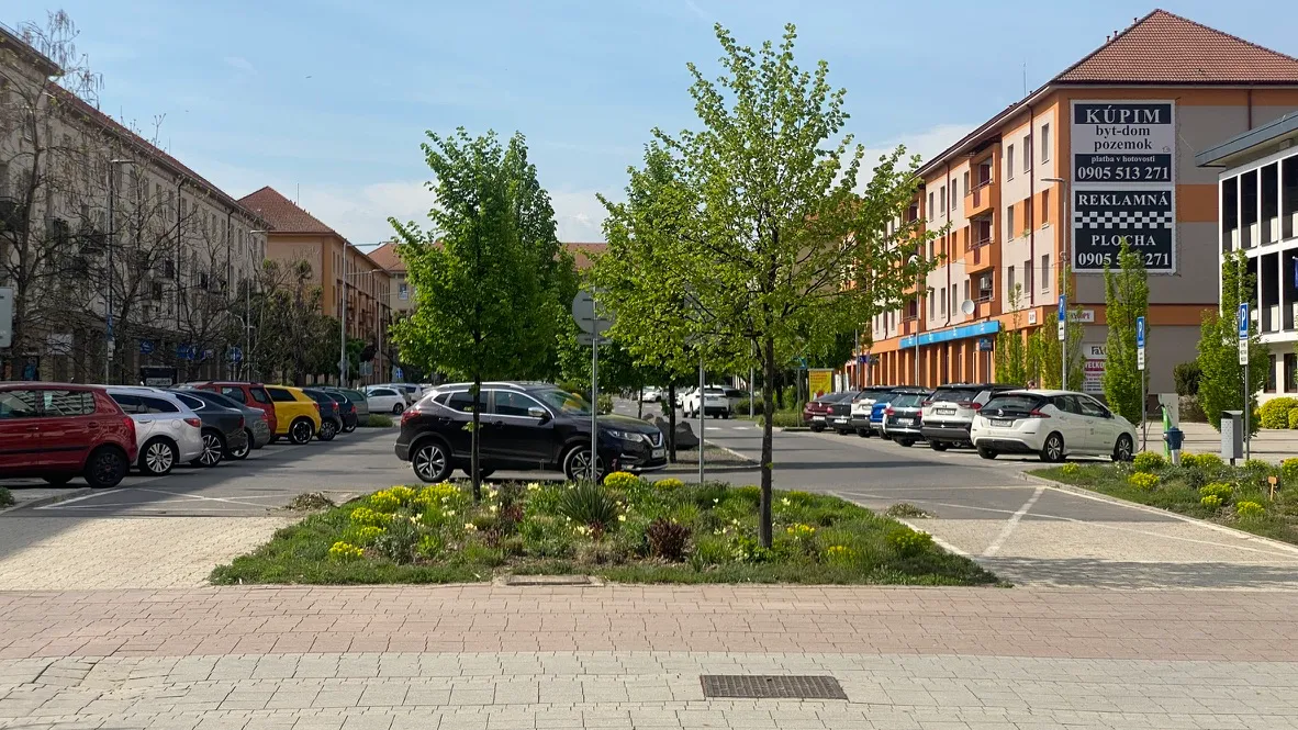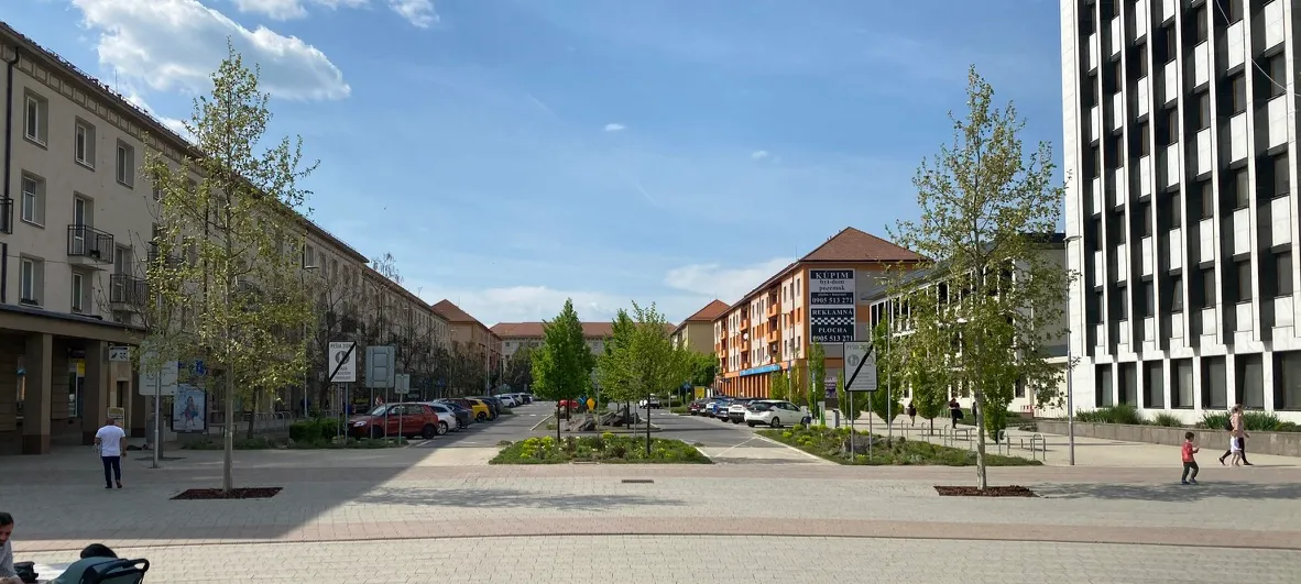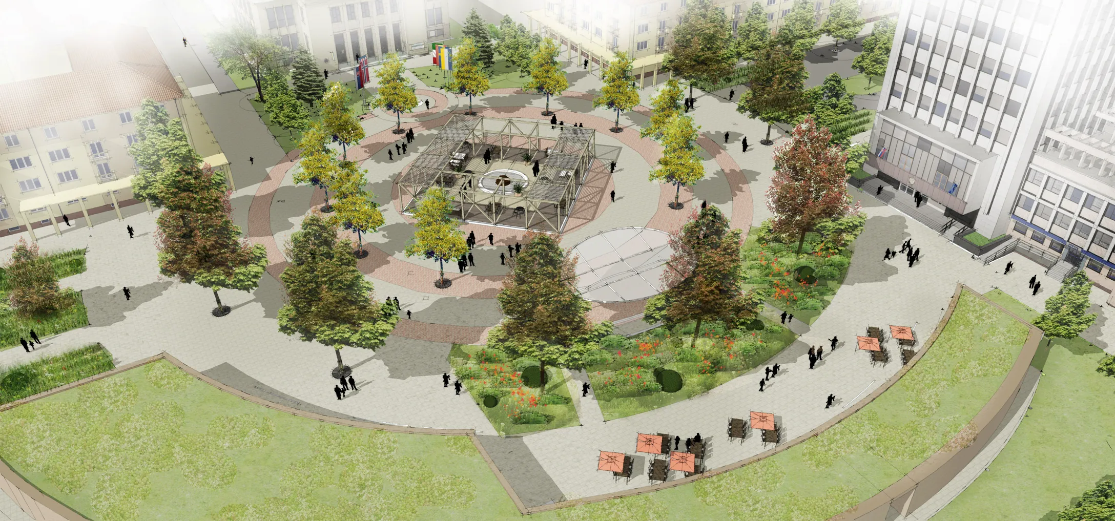 • námestie – ponechať kruhový tvar námestia aj s dlažbou a centrálnym pobytovým kubusom, ale doplnením námestia o 2 rady stromov, s vysoko nasadenými korunami, v kružniciach so stredom v kruhovom námestí a tým vytvoriť parkové námestie, kde však stromy niesú prekážkou v pohybe ľudí a prípadne i áut a ani v prípade poriadania kultúrno-spoločenských akcií, nakoľko koruny sú dostatočne vysoko aby neprekážali rušnému životu na námestí, ale zároveň esteticky a funkčne dotvorili námestie a zlepšili mikroklímu na ňom.