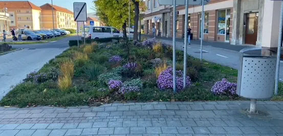 • Väčšina trávnikov na námestí i na ulici bola nahradená extenzívnymi trvalkovými záhonmi. Návrh aj s vizualizáciami je na ďalších stranách portfólia.